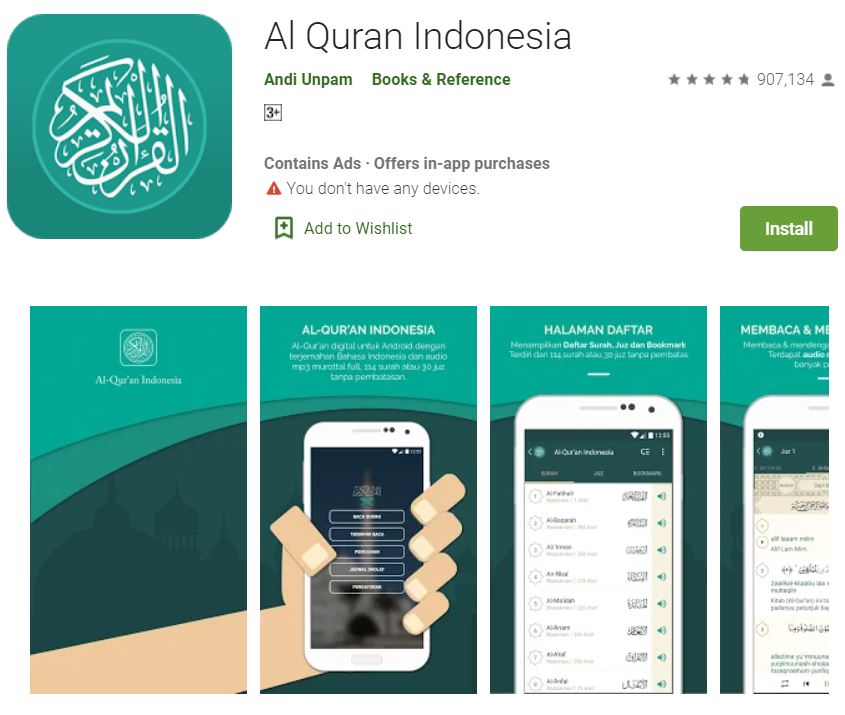 Aplikasi berikutnya yaitu al-quran indonesia, aplikasi ini di desain dengan semenarik mungkin dengan tampilan yang cukup baik. Di aplikasi ini tentunya kita selaku umat islam, diwajibkan dalam membaca al-quran. Di aplikasi ini kamu dapat belajar al-quran dengan baik serta dengan hukum tajwid yang benar.