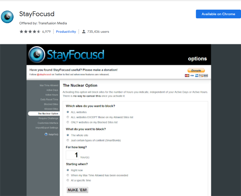 Stay Focusd bisa meningkatkan produktifitas kamu dengan membatasi jumlah waktu yang dapat kamu habiskan di situs yang membuang buang waktu. Ekstensi ini benar-benar memberi kamu sejumlah waktu tertentu yang kamu habiskan di situs web setiap hari. Setelah kamu melewati batas waktu, situs web akan diblokir.