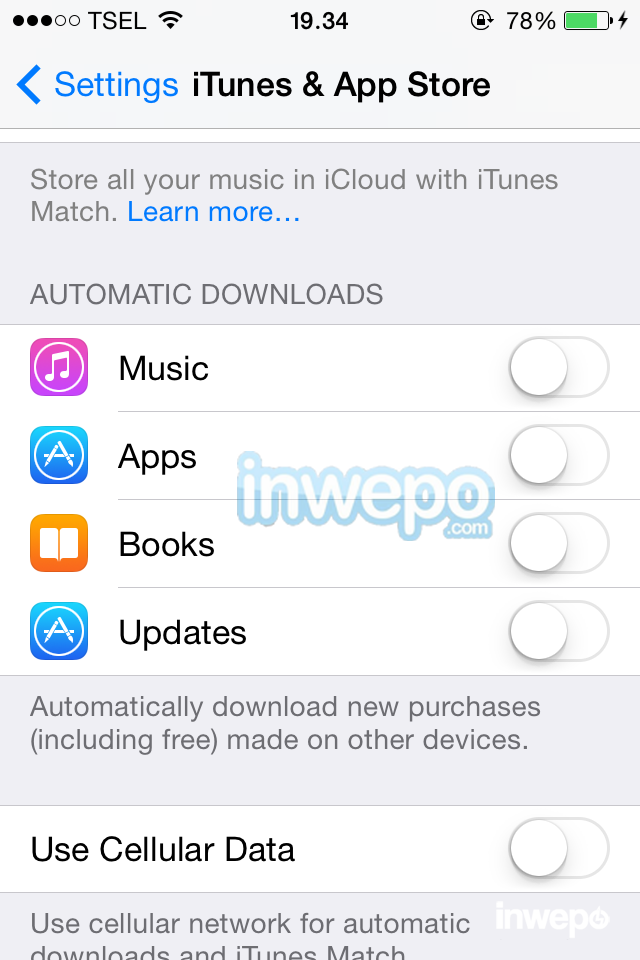 Auto-update apps adalah fitur yang sangat membantu di iOS 7, namun itu juga menyedot banyak tenaga baterai iPhone kalian. Kalian bisa mematikan dan meng-update secara manual apps kalian saat terhubung ke Wi-Fi. Untuk membuat pengaturan ini, kalian bisa menuju ke Settings, kemudian scroll ke bawah dan tap iTunes and App Store.