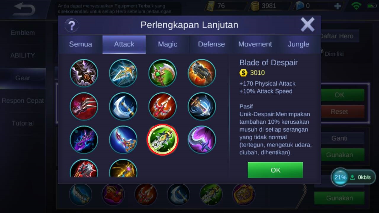 Item selanjutnya adalah Blade of despair, karena item ini akan memberikan +170% physical attack, +10% attack speed dan juga damage tambahan 10% apabila musuh terkena stun. Item ini ditempatkan di akhir karena harganya yang terbilang mahal.