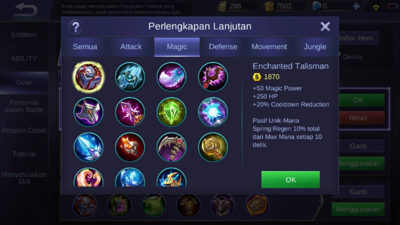 Item pertama yang di rekomendasikan adalah enchanted talisman, item ini menambahkan +50 magic power, +250 HP, +20% cooldown reduction, dan pasif unik nya : me-regenerasi 10% total dari max mana setiap 10 detik.