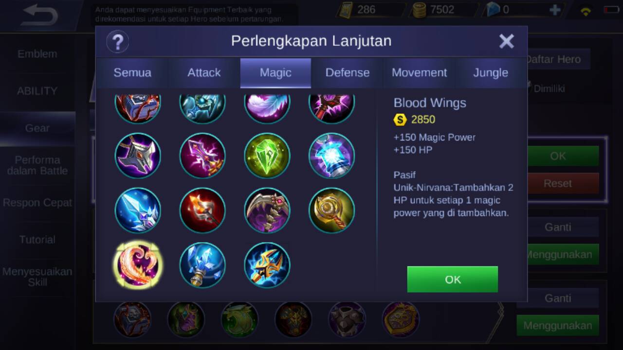 Item selanjutnya adalah blood wings, item ini akan menambahkan +150 magic power, +150 HP, dan pasif unik dari item ini adalah : akan mendapatkan tambahan 2 HP untuk setiap 1 magic power yang di tambahkan.