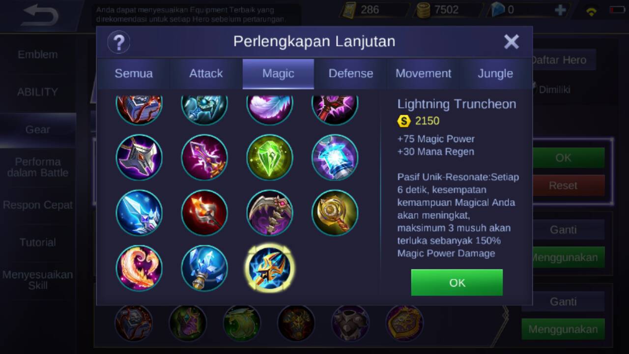 Item kelima yaitu lightning truncheon, karena akan membuat damage Chang’e lebih sakit, bagaimana tidak. Di item ini akan menambahkan +75 magic power, dan juga +30 mana regen, jadi lebih enak untuk spam skill-skill Chang’e, dan pasif unik item ini adalah setiap 6 detik ketika menyerang musuh, musuh kamu bakal terkena efek seperti tersambar petir yang akan memberikan 150% magic power damage (max 3 musuh)