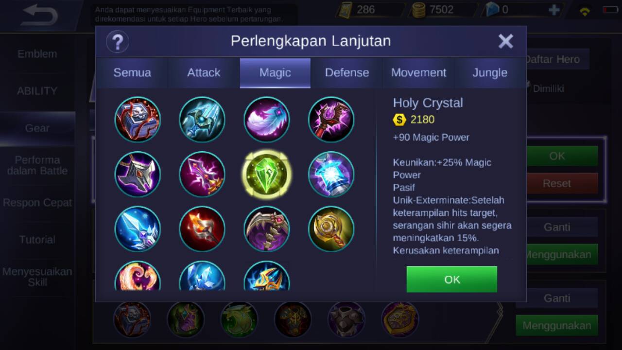 Dan yang terakhir bisa membeli holy crystal, karena item ini akan menambahkan +90 magic power, keunikan : +25% magic power, dan pasif unik dari item ini adalah : apabila skill-skill Chang’e mengenai lawan, maka magic attack akan meningkat sebesar 15% dan untuk skill skill seterusnya, dan efek ini berlaku selama 3 detik dengan waktu cooldown selama 10 detik.
