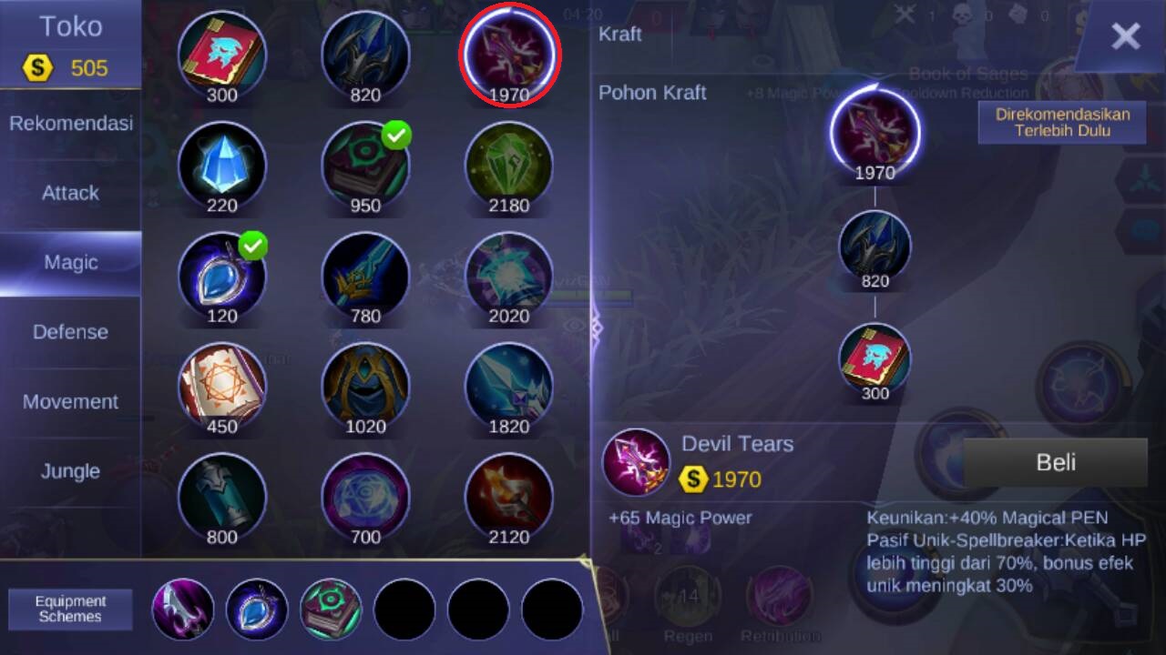 Item ke lima adalah Devil Tears karena item ini akan menambahkan +65 Magic Power dan juga unik nya akan menambahkan +40% Magic penetration dan juga apabila darah di atas 70%, akan mendapat bonus efek kemampuan item meningkat sebanyak 30%.