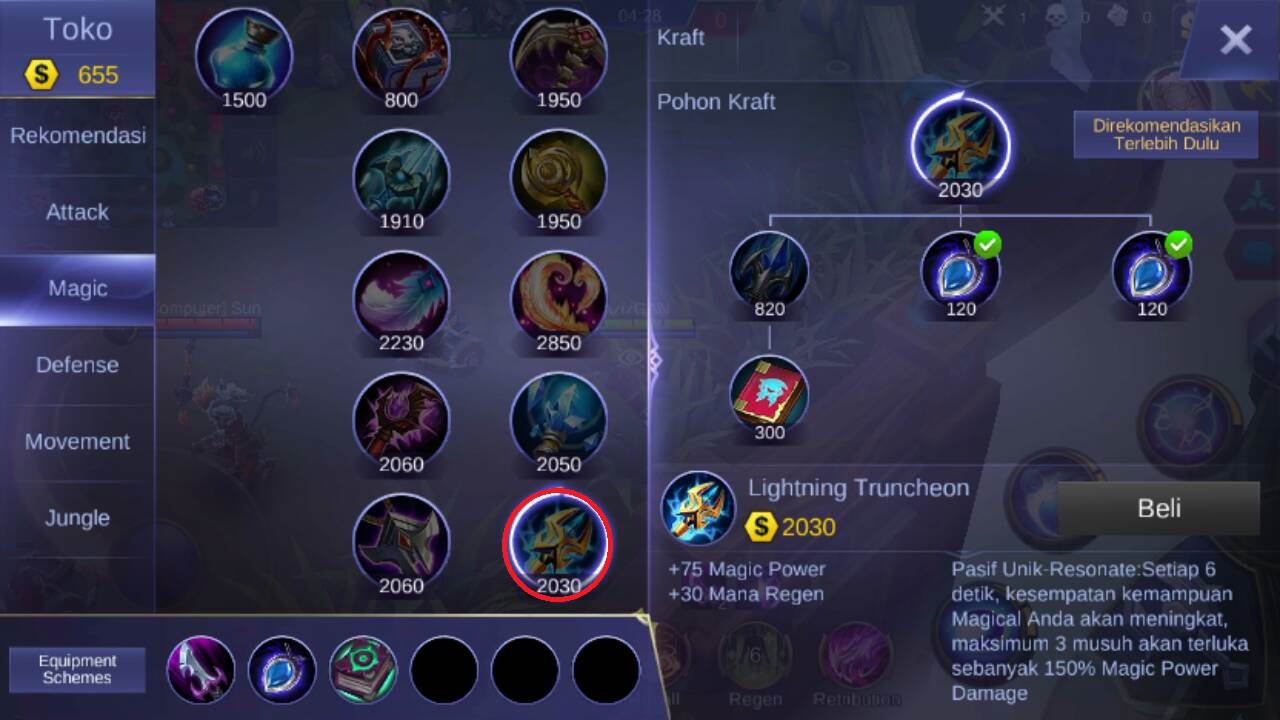 Item pertama yang wajib di beli adalah Enchanted Talisman karena akan menambahkan  +50 Magic Power, +250 HP dan +20% Cooldown Reduction, dan juga item ini akan memberikan regen mana sebanyak +10% tiap 10 detik jadi tidak perlu takut untuk spam spam skill.