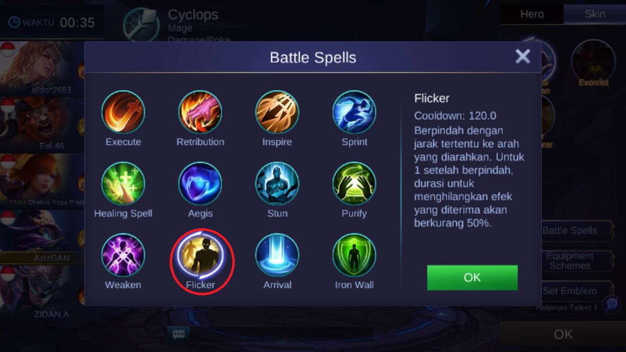 Untuk cyclop di rekomendasikan untuk menggunakan flicker , karena Cyclops sendiri yang tidak bisa kabur ketika di ciduk musuh musuh nya. Namun apabila Cyclops kamu di tempatkan di mid – line atau di tengah dapat menggunakan battle spells Retribution agar mempercepat farming dan mencuri buff musuh.