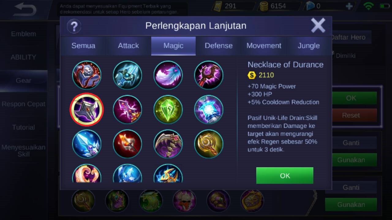 Dan yang terakhir di rekomendasikan untuk di beli adalah necklace of durance, karena item ini akan menambahkan +70 magic power, +300 HP, +5% cooldown reduction, item ini memiliki pasif unik berupa : apabila Digger mengeluarkan skill yang memberikan damage dan mengenai musuh, akan mengurangi efek regen sebesar 50% untuk 3 detik.