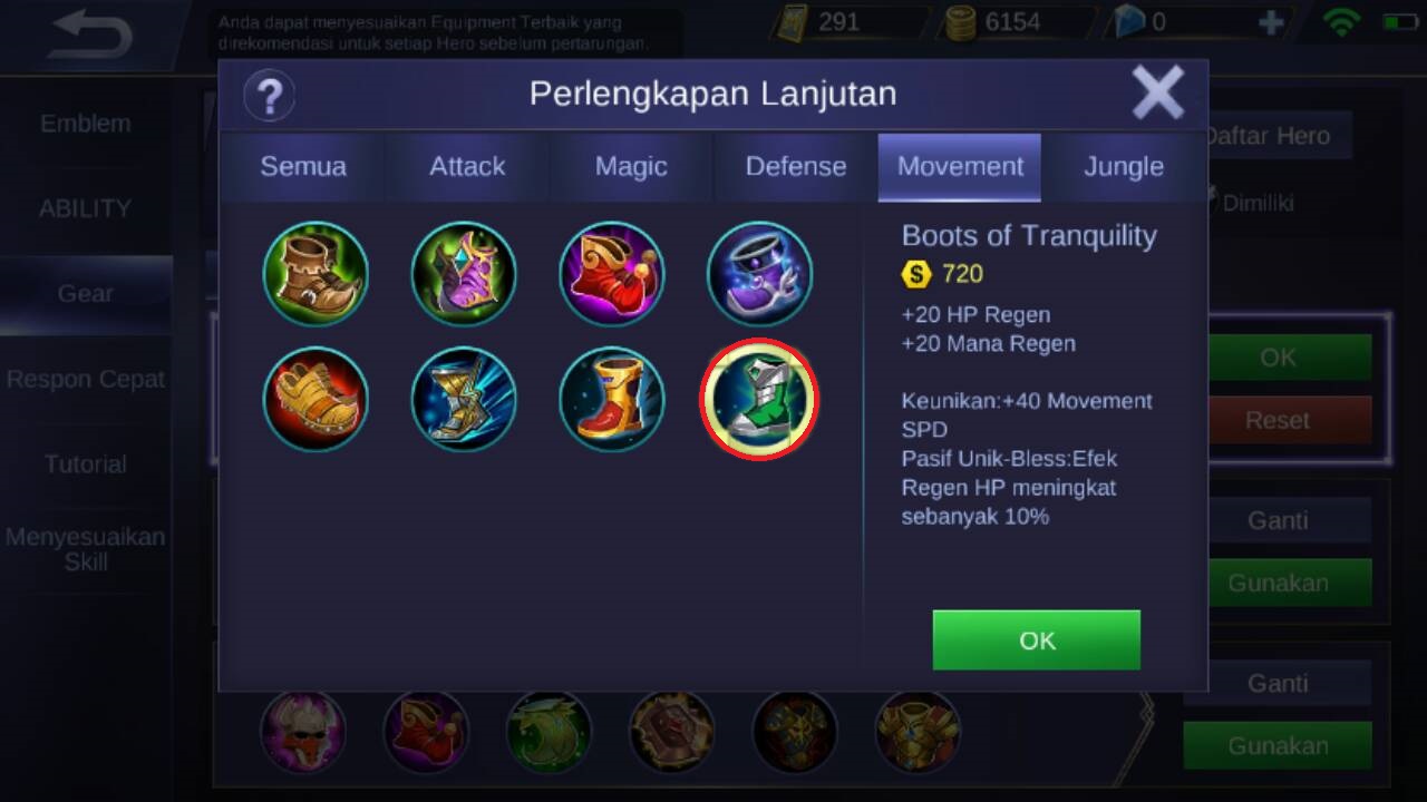 Item pertama yang harus di beli adalah sepatu “Boots of Tranquility” karena akan memberikan +20 HP regen, +20 Mana regen, dan akan memberikan +40 Movement speed, keunggulan dari sepatu ini adalah apabila memberikan assist, Digger akan mendapatkan bonus gold.