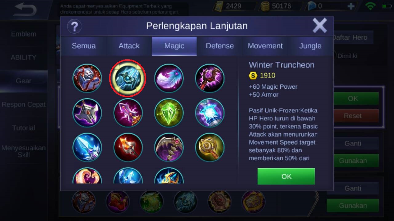Untuk item ketiga bisa membeli Winter Truncheon, karena item ini dapat menambahkan +60 Magic Power dan +50 Armor, dan item ini memiliki pasif unik berupa : ketika HP estes di bawah 30% dan estes terkena hit musuh, musuh akan terkena efek penurunan movement speed sebesar 80%. Dan apabila estes terkena hit musuh bertipe magic, musuh itu juga akan terkena 50% dari magic power. Namun efek ini memiliki cooldown selama 5 detik.