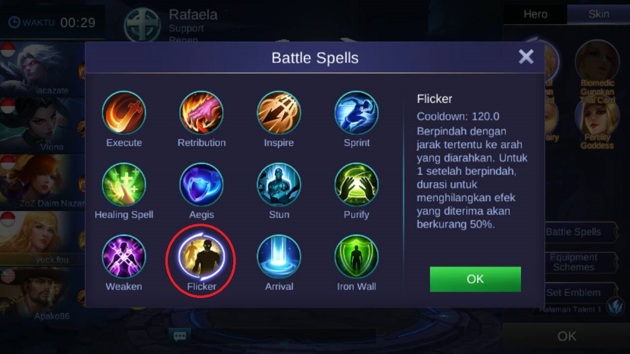 Untuk battle spellsnya, Estes direkomendasikan untuk menggunakan spells flicker dikarenakan estes merupakan hero yang digunakan hanya untuk play safe karena hero ini identik dengan melindungi diri sendiri dan melindungi rekan satu tim.
