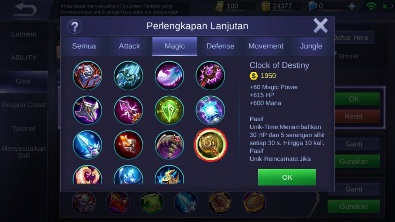 Item pertama yang di rekomendasikan adalah clock of destiny, karena akan memberikan +60 magic power, +615 HP, +600 mana, dan pasif unik dari item ini adalah akan menambahkan +30 HP dan 5 serangan sihir setiap 30 detik sampai 10 kali dan pasif unik lainnya : jika waktu sepenuhnya ditumpuk, maka hero akan menerima 5% serangan sihir dan 300 mana. Jadi item ini bukan hanya menambahkan magic damage saja, tetapi juga akan menambahkan HP dari Eudora agar lebih keras lagi di awal awal game.