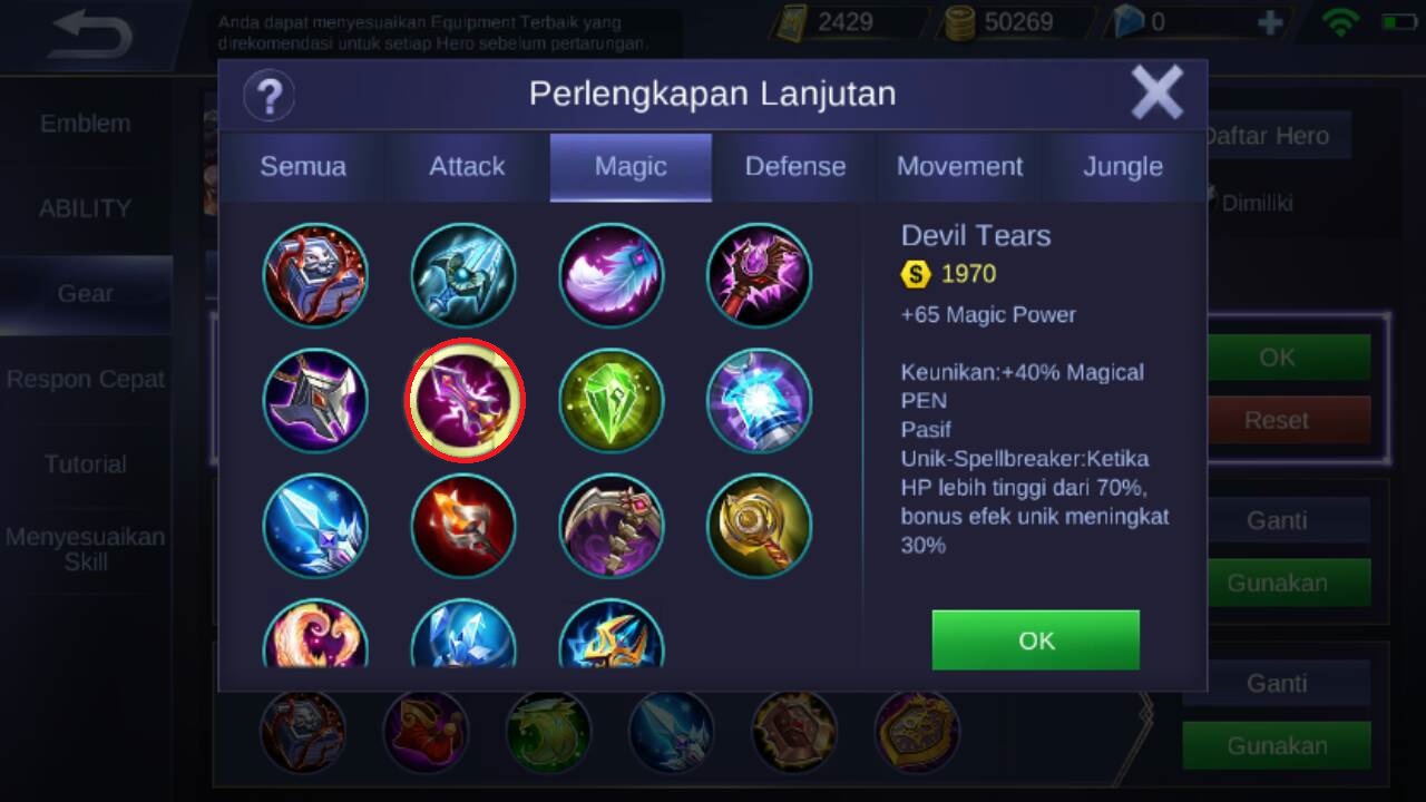 Item kelima yaitu devil tears, karena item ini akan menambahkan +65 magic power, keunikan : +40% magic PEN, dan pasif unik dari item ini : ketika HP di atas 70%, bonus efek unik meningkat 30%.