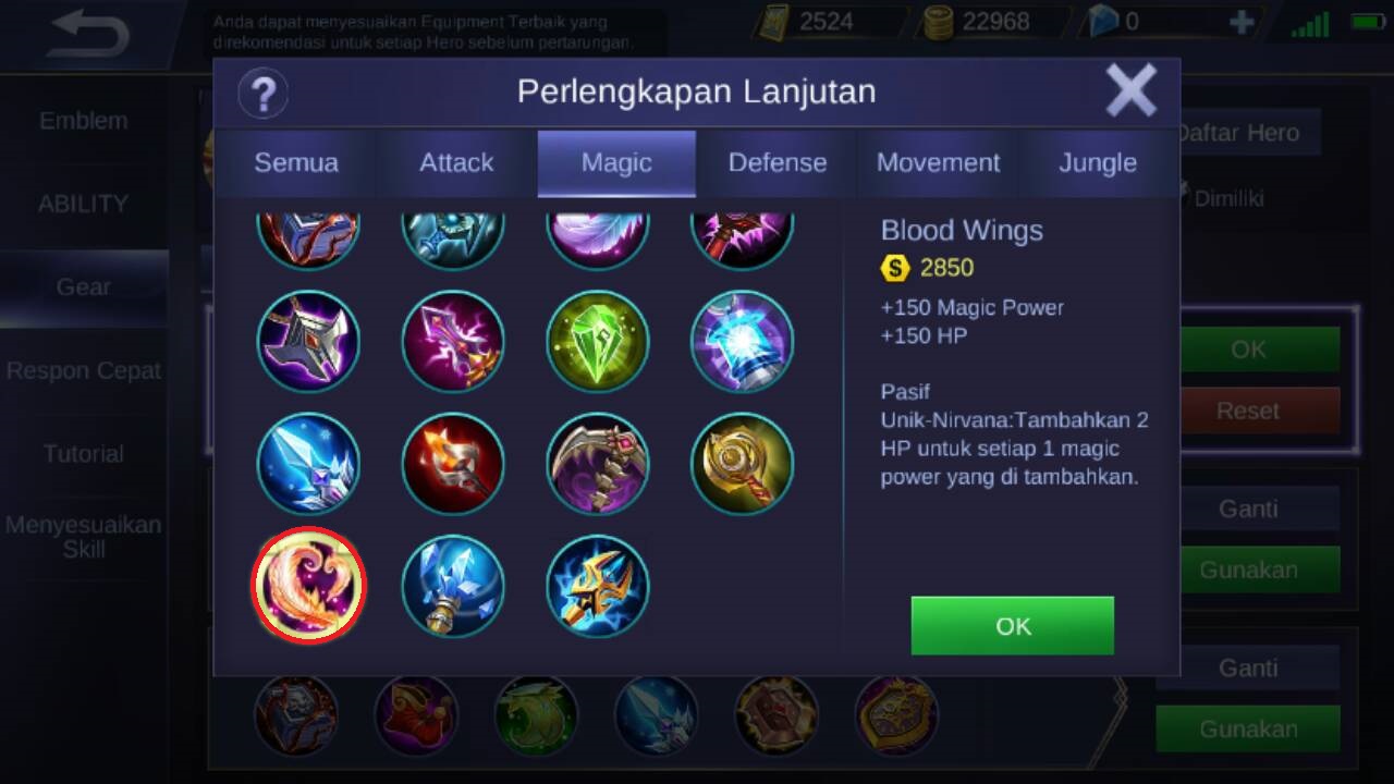 Dan yang terakhir bisa membeli blood wings yang berfungsi untuk menambahkan +150 magic power dan +150 HP. Dan item ini memiliki pasif unik berupa menambahkan 2 HP untuk setap 1 magic power yang di berikan ke musuh.