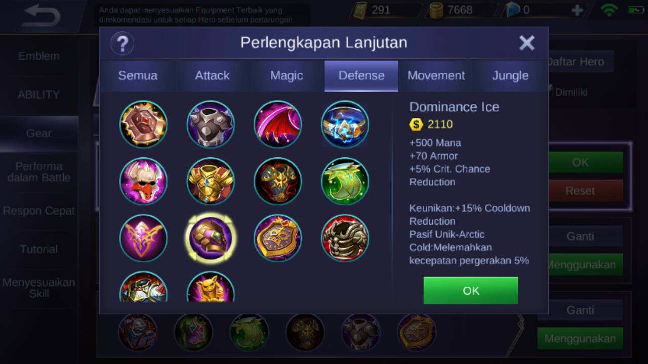 Untuk selanjutnya item kedua Grock adalah dominance ice, karena item ini akan memberikan +500 mana, +70 armor, +5% crit. Chance reduction, +15% cooldown reduction dan pasif unik dari item ini berupa : akan melemahkan kecepatan pergerakan musuh sebanyak 5% dan juga akan melemahkan attack speed musuh sebanyak 30% apabila si Grock dekat dengan musuh.