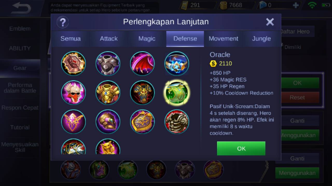 Dan selanjutnya untuk item yang kelima adalah oracle, karena item ini akan memberikan +850 HP, +36 magic RES, +35 HP regen, +35 HP regen, +10% cooldown reduction, dan pasif unik dari item ini adalah : setelah Grock di serang musuhnya, dia akan mendapatkan regen HP 8% selama 4 detik. Efek tersebut memiliki waktu cooldown selama 8 detik.