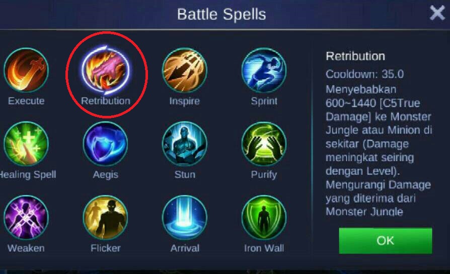 Untuk battle spells nya di rekomendasikan untuk menggunakan retribution, karena spells ini akan mempercepat Gusion farming, dan ketika di upgrade ke lavel 2, spells ini dapat di gunakan untuk men-slow musuh.