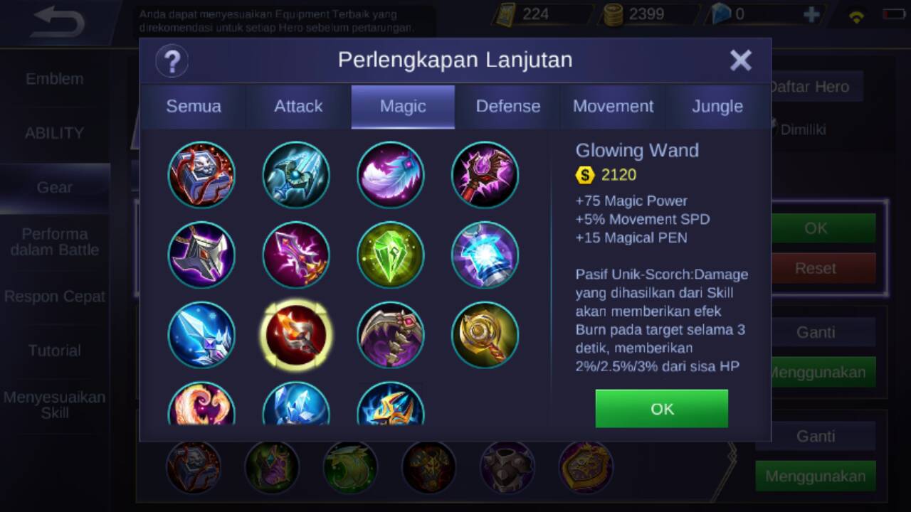 Item kedua adalah Glowing Wand, item ini memberikan +75 magic power, +5% movement speed, +15 megical PEN, dan item ini memiliki Pasif-unik-Scourch: Burn target selama 3 detik ketika skill mengenai musuh dan memberikan 2% – 3% dari HP musuh saat ini sebagai Magic Damage. Hingga 10 poin.