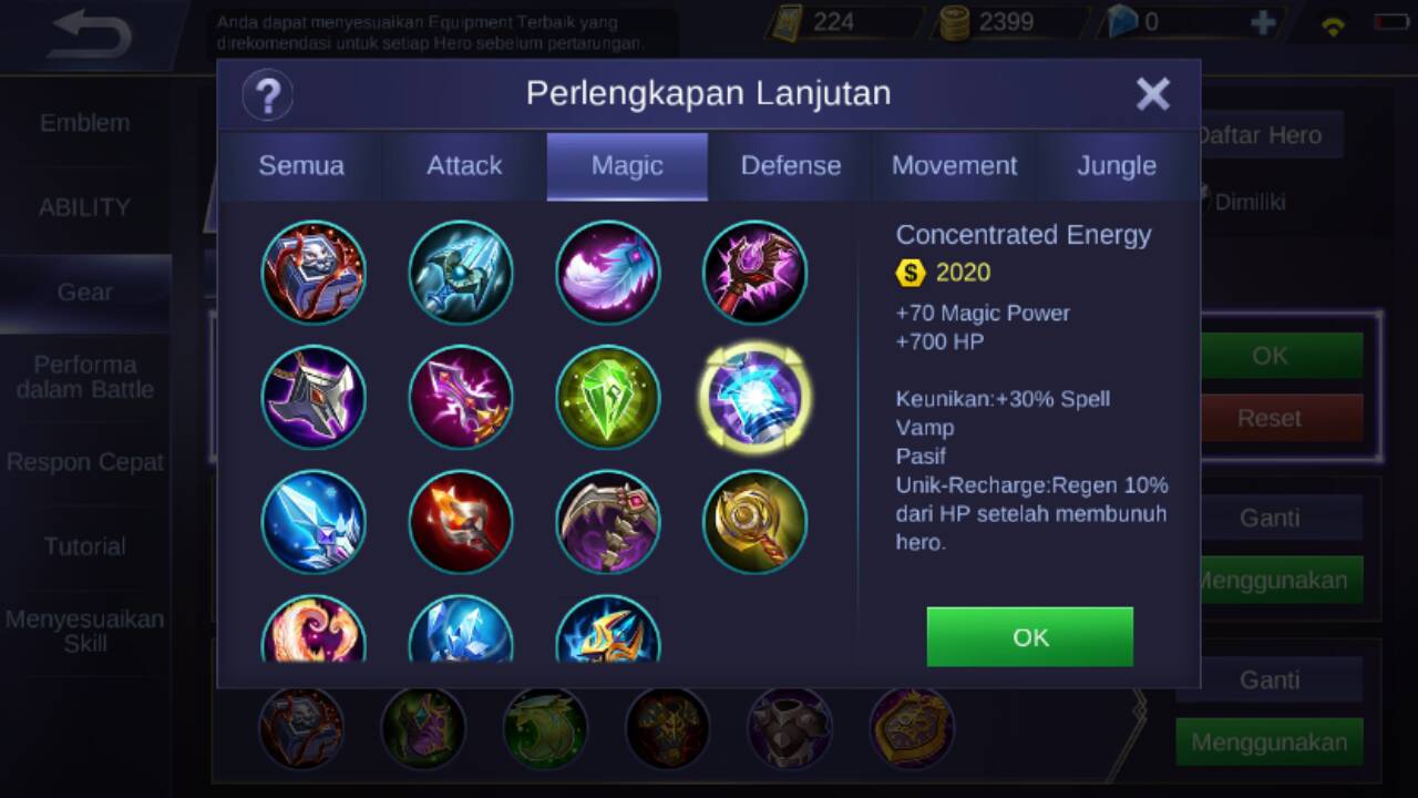 Selanjutnya dapat membeli concentrated energy, item yang akan memberikan tambahan +70 magic power, +700 HP dan pasif unik nya adalah akan memberikan +30% spell vamp juga regen 10% ketika telah membunuh musuh. Item lifesteal yang pas untuk Gusion agar memberikan tambahan darah.