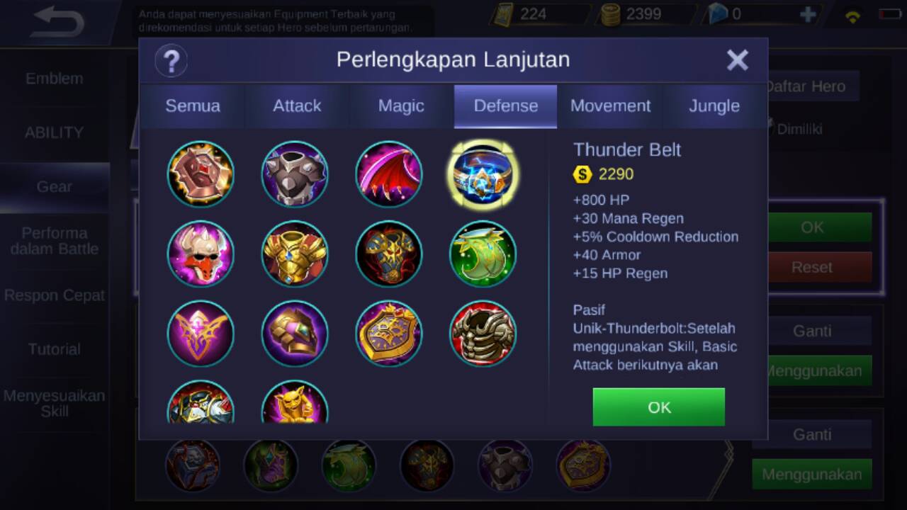 Item selanjutnya adalah thunder belt, item ini akan memberikan +800 HP, +30 mana regen, +5% cooldown reduction, +40 armor, +15 HP regen, pasif unik dari item ini adalah : setelah Gusion menggunakan skill, Gusion akan dapat damage lebih 50% dari serangan fisik, dan sifatnya true damage, dan akan memberikan efek slow ke musuh selama 1.5 detik. Dan efek tersebut memiliki waktu cooldown selama 1.5 detik.