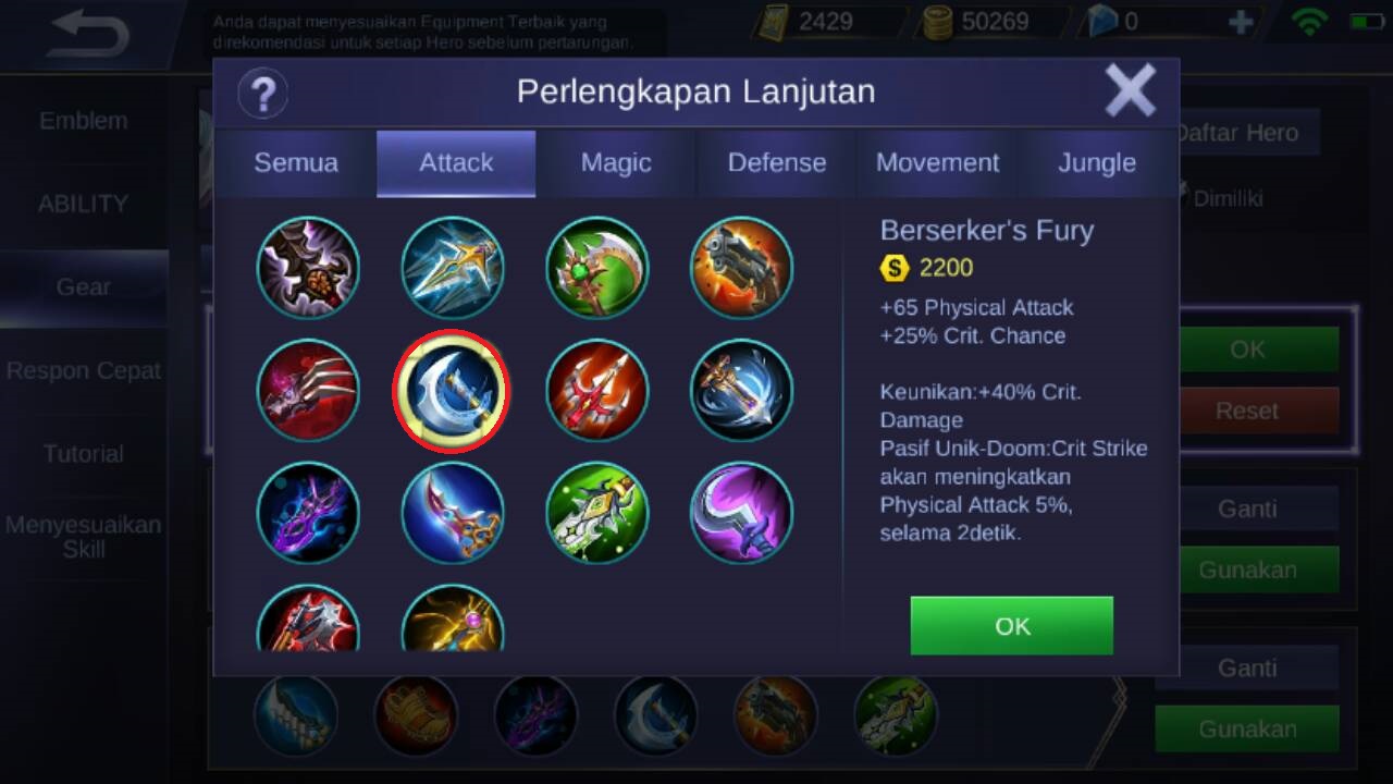 Selanjutnya untuk item ketiga adalah Berseker’s Fury. Item ini menambahkan +65 physical attack, +25% Crit Chance dan juga keunikan item ini akan menambahkan +40% Crit Damage, sementara Pasifnya berupa Crit Strike akan meningkatkan physical attack 5% selama 2detik