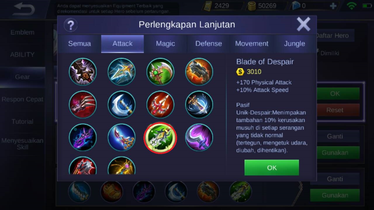 Dan untuk item yang terakhir Irithel dapat memilih item Blade Of Despair yang akan memberikan tambahan +10% attack speed, +170 ekstra physical attack, dan pasif unik dari item ini berupa : ketika musuh terkena stun, melayang ke atas, dan lain sebagainya akan memberikan tambahan attack sebesar 10% terhadap musuh.