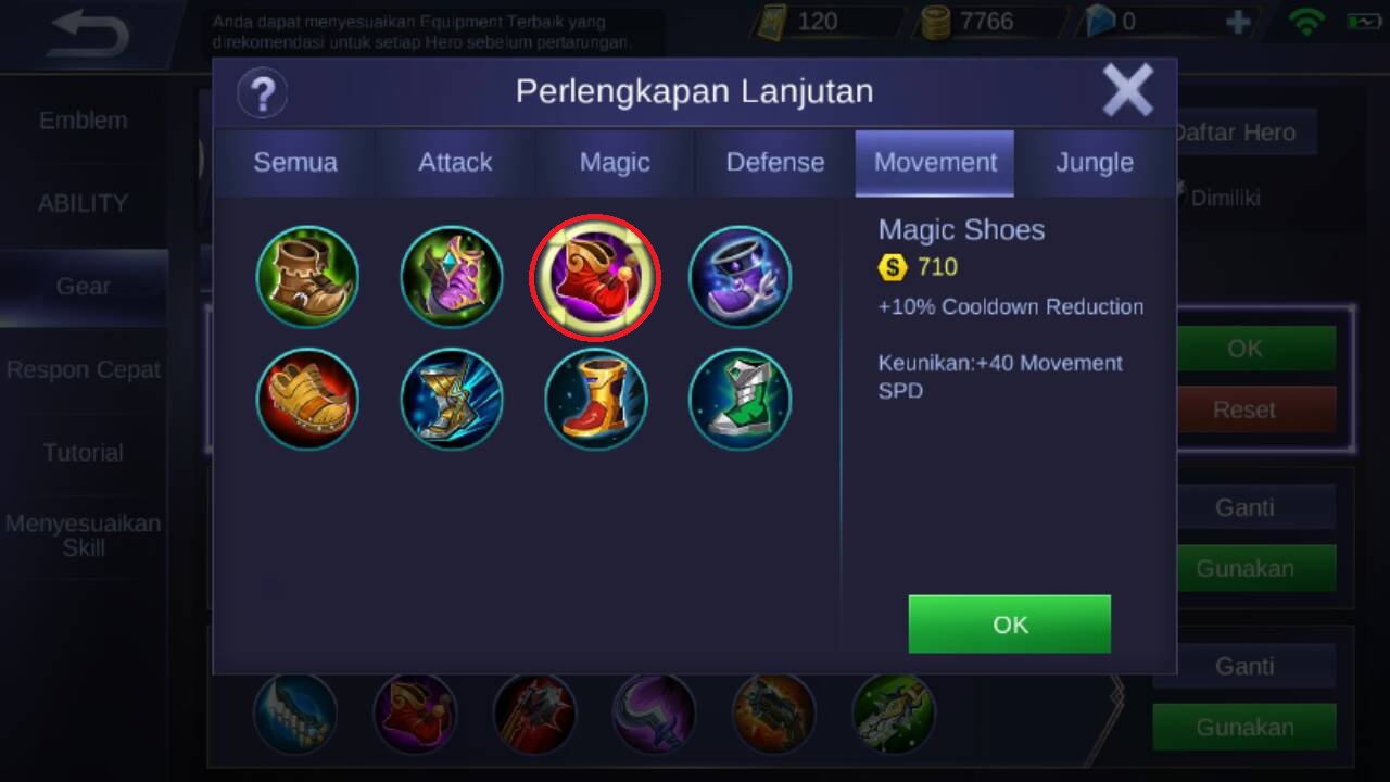 Item pertama yang di rekomendasikan untuk di beli adalah Magic shoes, karena item ini akan memberikan +10% cooldown reduction, dan +40 movement speed. Item ini bagus untuk lancelot karena membuat cooldown dari skill skill nya sedikit berkurang.