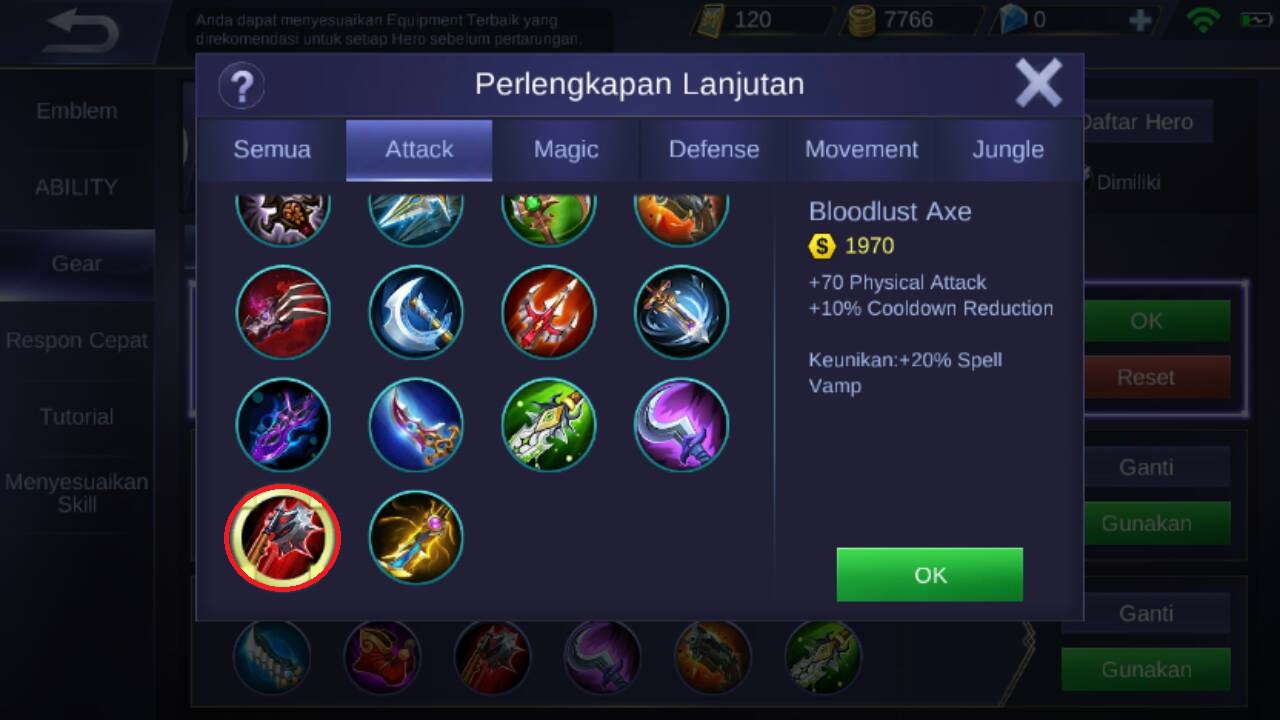 Item selanjutnya adalah bloodlust axe, item wajib bagi lancelot karena akan memberikan +70 physical attack, +10% cooldown reduction dan +20% spells vampir, artinya setiap musuh kena skill skill lancelot, akan menambahkan darah lancelot itu sendiri karena efek spells vampir.