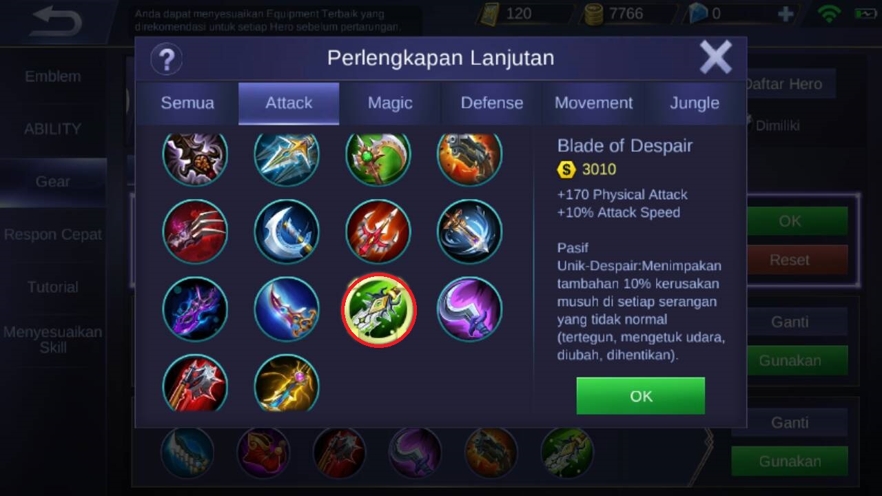 Item ketiga adalah blade of despair, karena item ini akan memberikan +170 physical attack, +10% attack speed dan juga apabila musuh terkena stun, item ini akan menambahkan damage sebesar 10%. Jadi akan membuat Lancelot memiliki damage yang lebih sakit lagi.