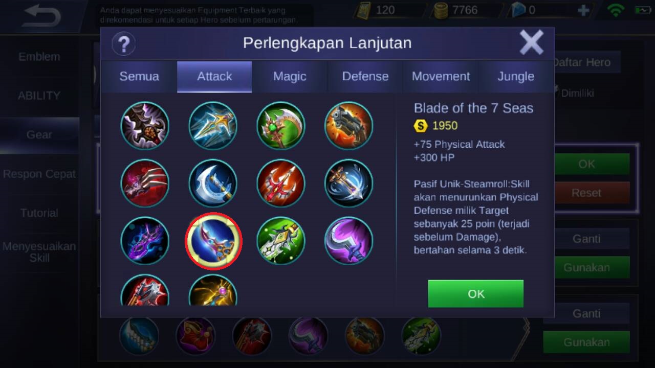 Selanjutnya direkomendasikan untuk membeli blade of the 7 seas, karena item ini akan memberikan +75 physical attack, +300 HP dan pasif unik dari item ini adalah akan membuat lancelot menurunkan physical defense musuh sebanyak 25 poin (setiap skill skill nya yang mengenai musuh) dan akan bertahan selama 3 detik.