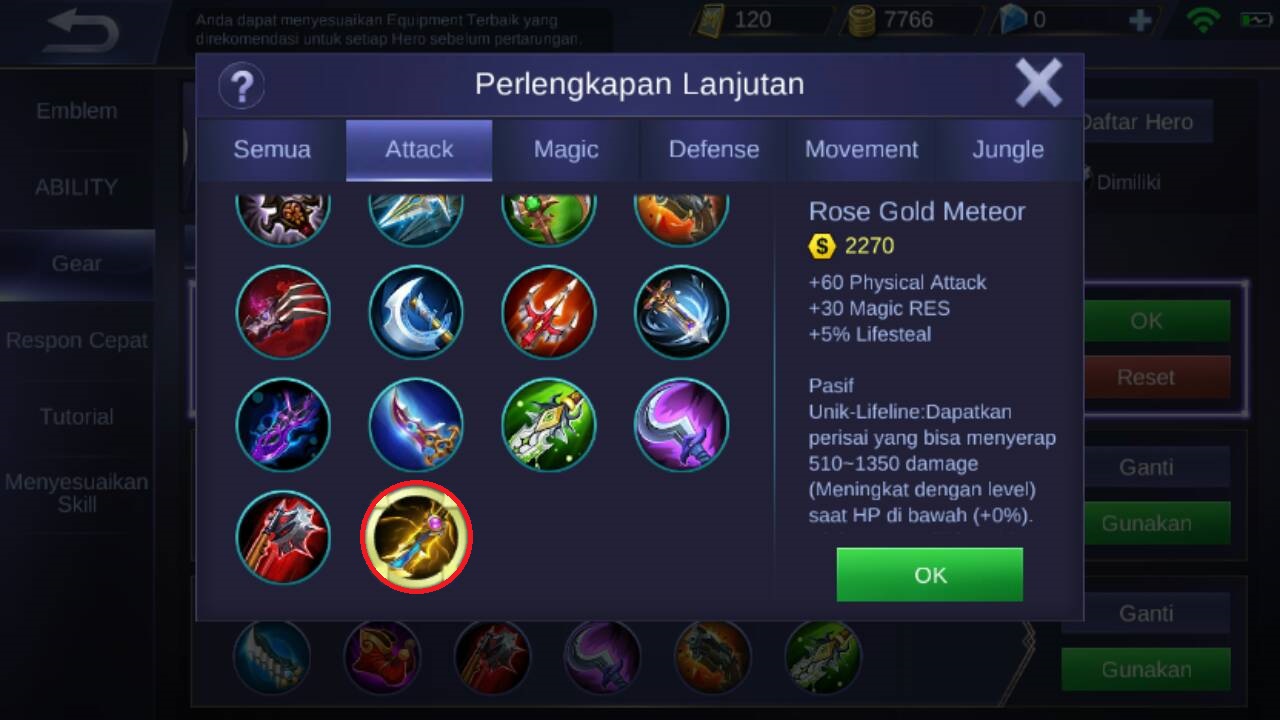 Item selanjutnya adalah rose gold meteor, item ini akan memberikan +60 physical attack, +30 Magic RES, +5% Lifesteal dan pasif unik dari item ini yaitu ketika darah lancelot kurang dari 30%, akan muncul perisai yang akan menyerap damage antara 510-1350 dan akan meningkat sesuai dengan level.
