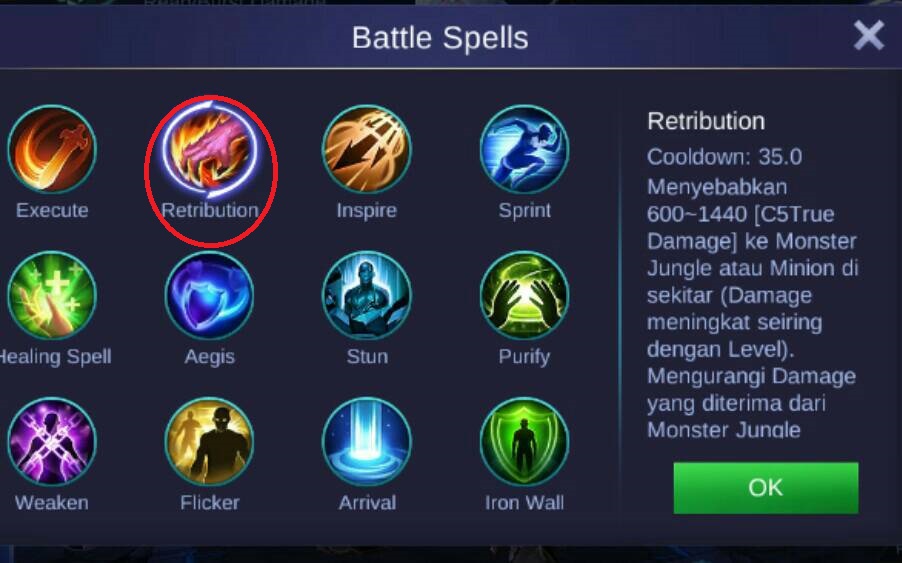 Kemudian untuk battle spells di rekomendasikan untuk menggunakan retribution karena spells ini akan mempercepat proses farming sehingga membuat Lancelot semakin cepat untuk naik level dan menjadikan item item di atas, spells ini juga dapat membantu ketika 1 vs 1 karena retribution bisa mengenai musuh yang membuat musuh mendapat efek slow.