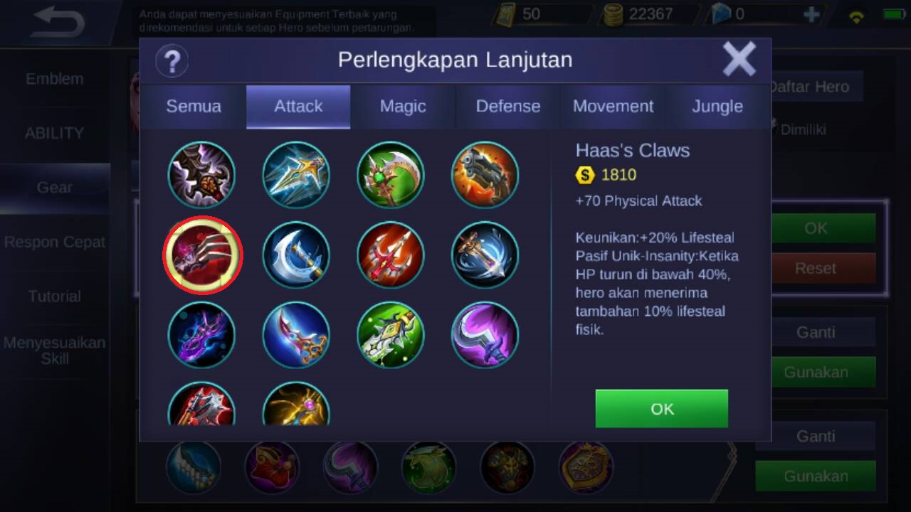 Item pertama yang di rekomendasikan untuk di beli adalah haas’s claws, item ini akan menambahkan +70 physical attack, +20% lifesteal dan pasif uniknya ketika HP turun di bawah 40%, martis akan menerima tambahan lifesteal. Jadi item ini sangat bagus untuk di beli di awal karena akan memberikan lifesteal yang besar di awal game bagi martis.