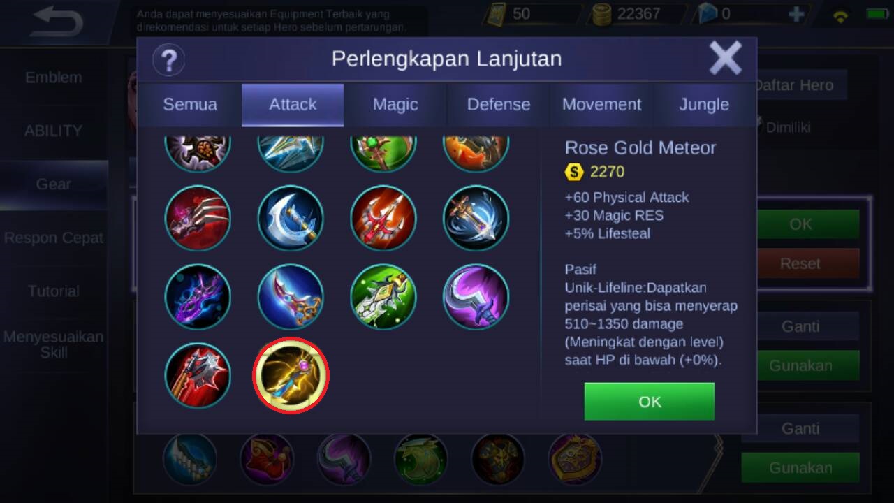 Selanjutnya di rekomendasikan untuk membeli rose gold meteor, karena akan memberikan martis +60 physical attack, +30 magic RES, +5% lifesteal dan bagus nya lagi item ini memiliki pasif berupa : akan mendapatkan perisai yang bisa menyerap 510-1350 damage ketika darah martis dibawah 30%, namun efek ini memiliki cooldown selama 30 detik. Item ini sangat membantu untuk menyelamatkan martis dari kematian karena perisai tersebut.