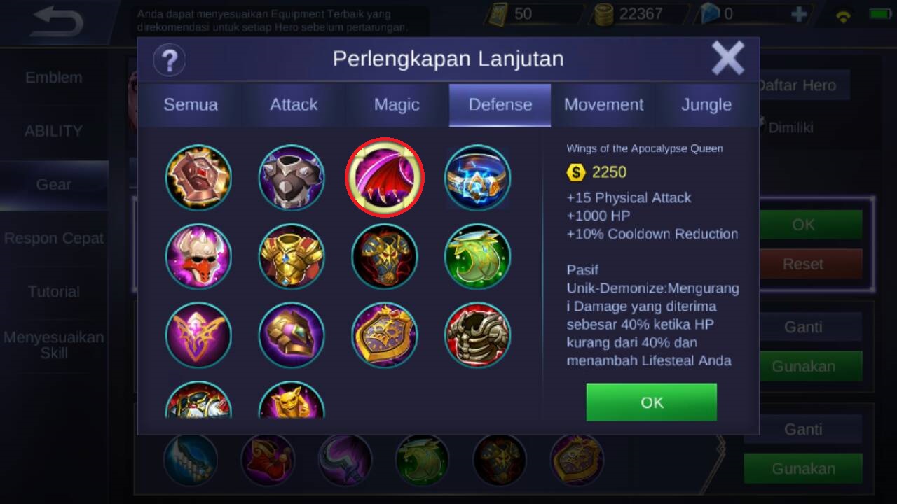 Dan berikutnya item yang di beli adalah wings of the apocalypse queen, item defense ini yang sekiranya cocok untuk martis karena akan memberikan +15 physical attack, +1000 HP, +10% cooldown reduction dan pasif unik dari item ini berupa mengurangi damage yang diterima sebesar 40% apabila HP kurang dari 40% dan juga akan mendapatkan efek lifesteal. Jadi meskipun darah martis sedikit, dia tetap bisa bertahan hidup karena item ini memiliki pasif unik dan memberikan lifesteal.