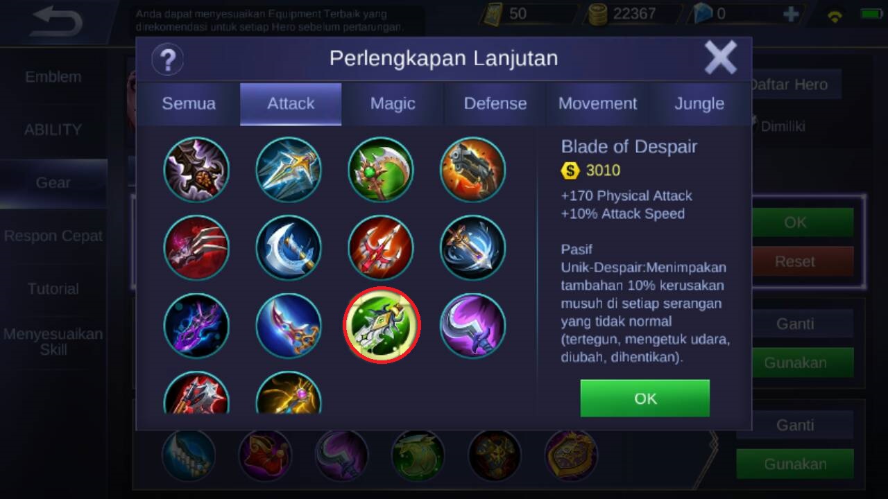 Yang terakhir adalah blade of despair, karena setelah sebelum sebelumnya membeli item yang kebanyakan menambahkan lifesteal kini martis butuh tambahan damage. Karena item ini sendiri akan memberikan +170 physical attack, +10% attack speed dan pasif dari item ini berupa tambahan damage terhadap musuh terkena efek stun dan lain sebagainya.