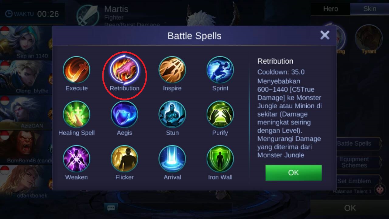 Battle spells yang di gunakan adalah retribution. Karena spells ini mempercepat dan mempermudah martis dalam farming, karena martis sangat membutuhkan level dan jadinya item item yang di rekomendasikan di atas. Jadi spells ini sangat cocok bagi martis.