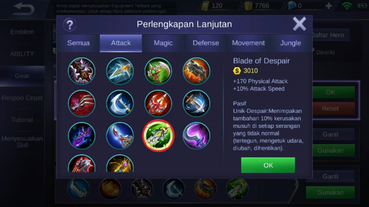 Dan yang terakhir adalah Blade og despair, karena item ini akan memberikan +170% physical attack, +10% attack speed dan juga damage tambahan 10% apabila musuh terkena stun. Item ini ditempatkan di akhir karena harganya yang terbilang mahal.