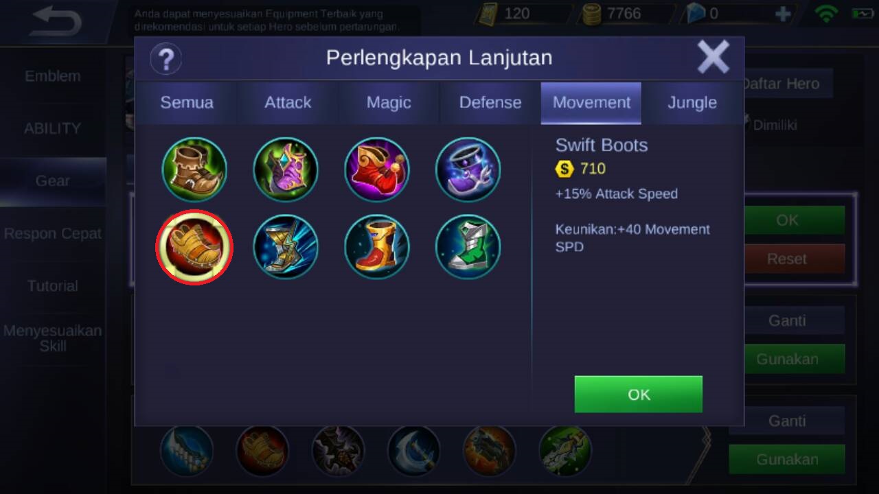 Item pertama adalah swift boots, karena item ini akan meningkatkan +15% attack speed yang akan membuat serangan moskov menjadi lebih cepat dan juga tentunya item ini akan meningkatkan +40% movement speed.