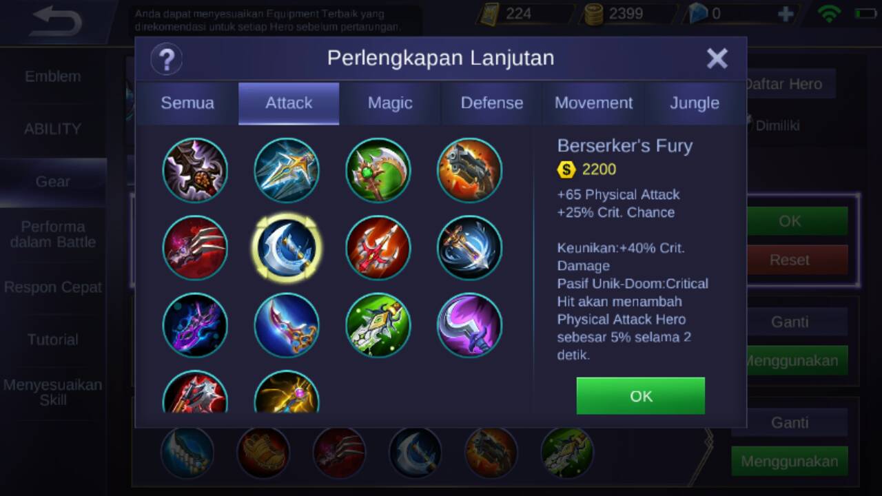 Item pertama yang di rekomendasikan untuk di beli adalah berserker’s fury, karena item ini akan memberikan +65 physical attack, +25% crit. Chance, +40% crit. Damage, dan pasif unik dari item ini adalah : apabila Natalia berhasil mengenai critical hit ke musuh akan menambahkan physical attack Natalia sebesar 5% selama 2 detik.
