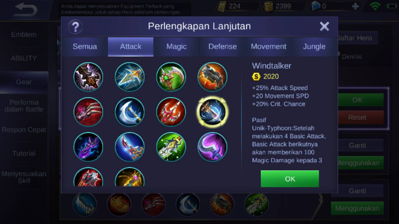 Selanjutnya direkomendasikan untuk membeli windtalker, karena item ini akan menambahkan +25% attack speed, +20 Movement speed, +20% Crit. Chance. Dan pasif unik item ini adalah : setelah memberikan 4 basic attack terhadap musuh, attack berikutnya akan mengalami penambahan sebanyak 100 magic damage kepada 3 lawan dan setelah itu movement speed Natalia akan naik sebanyak 5% untuk sementara.