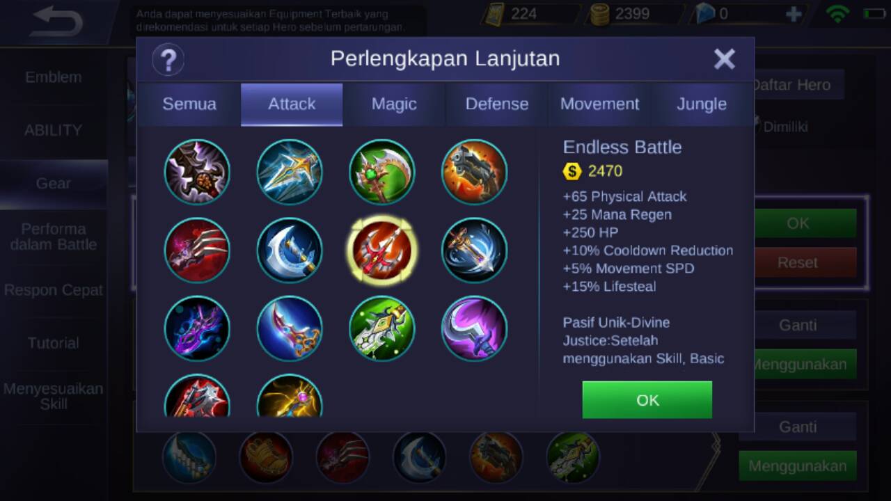 Item selanjutnya adalah endless battle, karena item ini akan menambahkan +65 physical attack, +25 mana regen, +250 HP, +10% cooldown reduction, +5% movement speed, +15% lifesteal, dan item ini memiliki pasif unik berupa : setelah Natalia mengeluarkan skill, attack selanjutnya akan bertambah damage sebanyak 85% sebagai true damage, namun efek ini memiliki waktu cooldown sebesar 1.5 detik. Dan apabila efek yang tadi aktif, maka akan menambahkan movement speed sebanyak 15%.