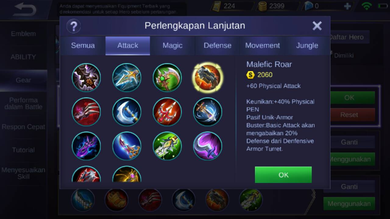 Dan yang di rekomendasikan untuk di beli adalah melefic roar, item ini akan menambahkan +60 physical attack, +40% physical PEN, dan bagusnya item ini akan mengurangi defensive armor musuh sebanyak 20% jadi sangat cocok untuk Natalia untuk mencuri tower musuh tower musuh.