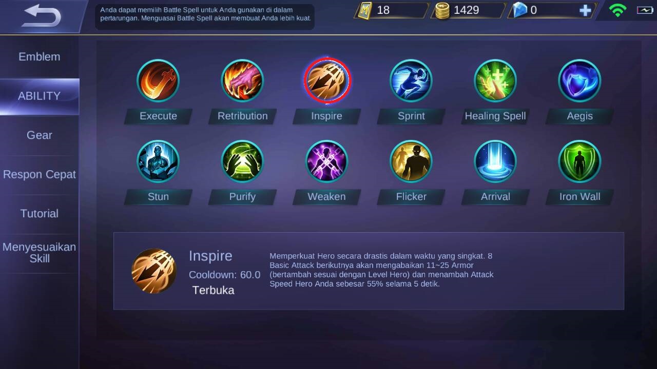 Kemudian untuk battle spells di rekomendasikan untuk menggunakan inspire atau fury, karena item ini akan meningkatkan attack speed Natalia, jadi sangat mendukung untuk menculik musuh satu persatu dan membunuh nya secara cepat karena spells ini.