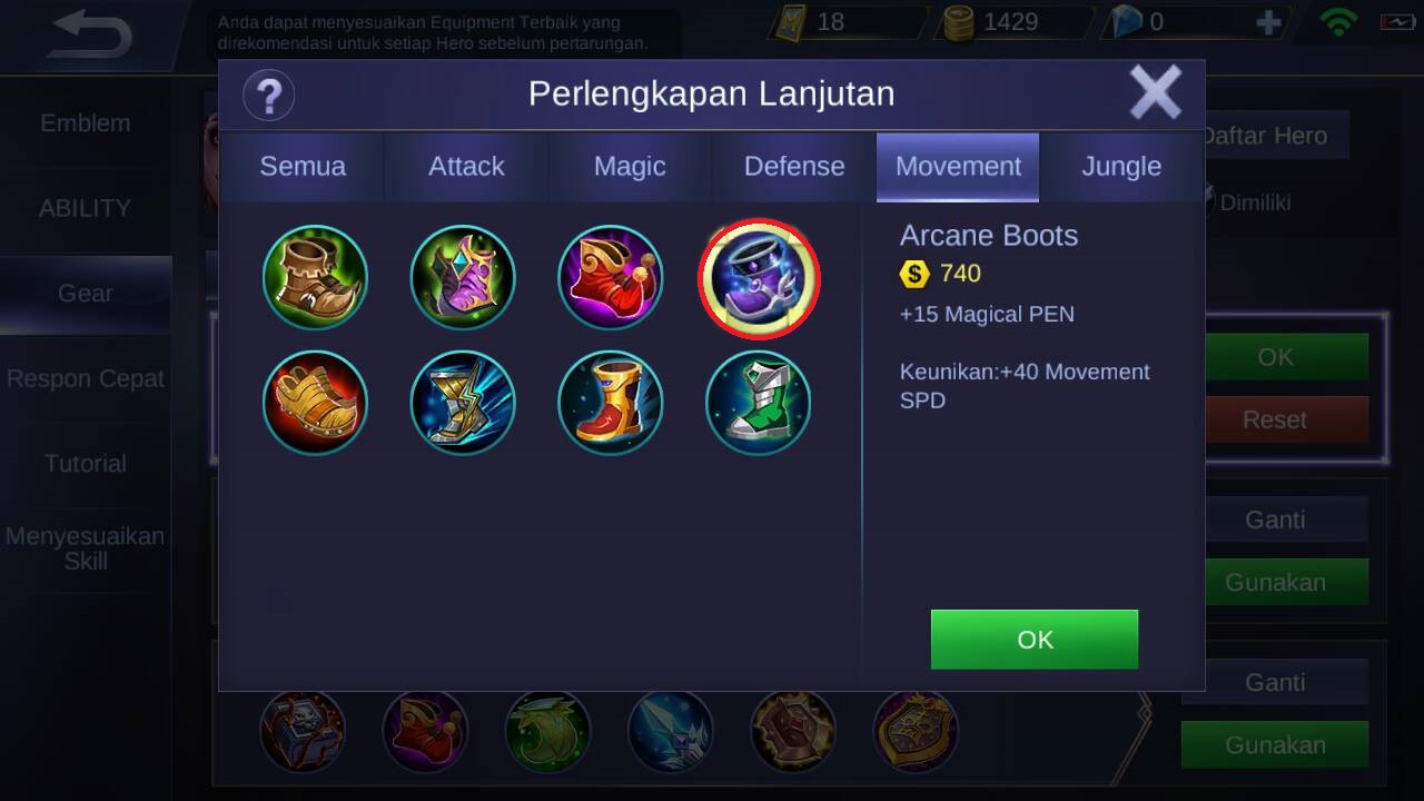 Item yang selanjutnya yang bisa dipilih adalah item jenis movement yang memiliki efek menambah 15 Magical PEN dan 40 Movement Speed. pasif unik item ini yaitu : apabila membantu membunuh musuh atau memberikan assist, pharsa akan mendapatkan hadiah 80 gold.