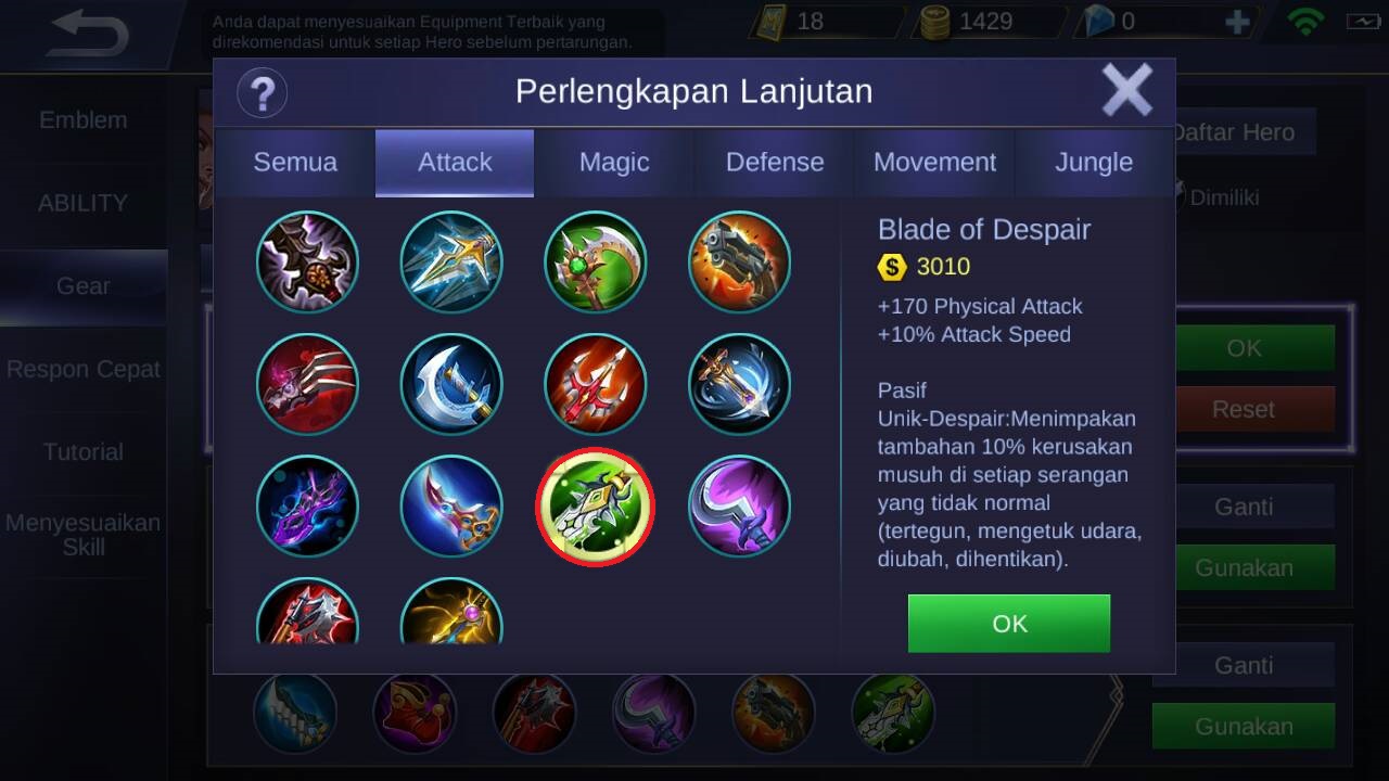 Berikutnya dapat membeli blade of despair, karena akan menambahkan +170 physical attack, +10% attack speed dan juga pasif item ini berupa : apabila musuh terkena efek (seperti stun, membeku, dan lain sebagainya) akan menambahkan damage sebesar 10%. Item ini akan membuat damage saber menjadi lebih sakit lagi.