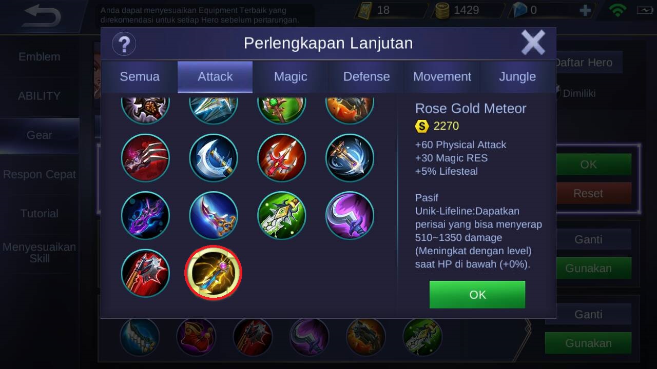 Item selanjutnya adalah rose gold meteor,karena akan menambahkan +60 physical attack, +30 magic RES, +5% lifesteal dan pasif item ini berupa : akan memberikan perisai ketika darah saber kurang dari 30% yang akan menyerap damage antara 510 – 1350 (akan meningkat sesuai level). Jadi sangat cocok untuk saber karena pasif uniknya.