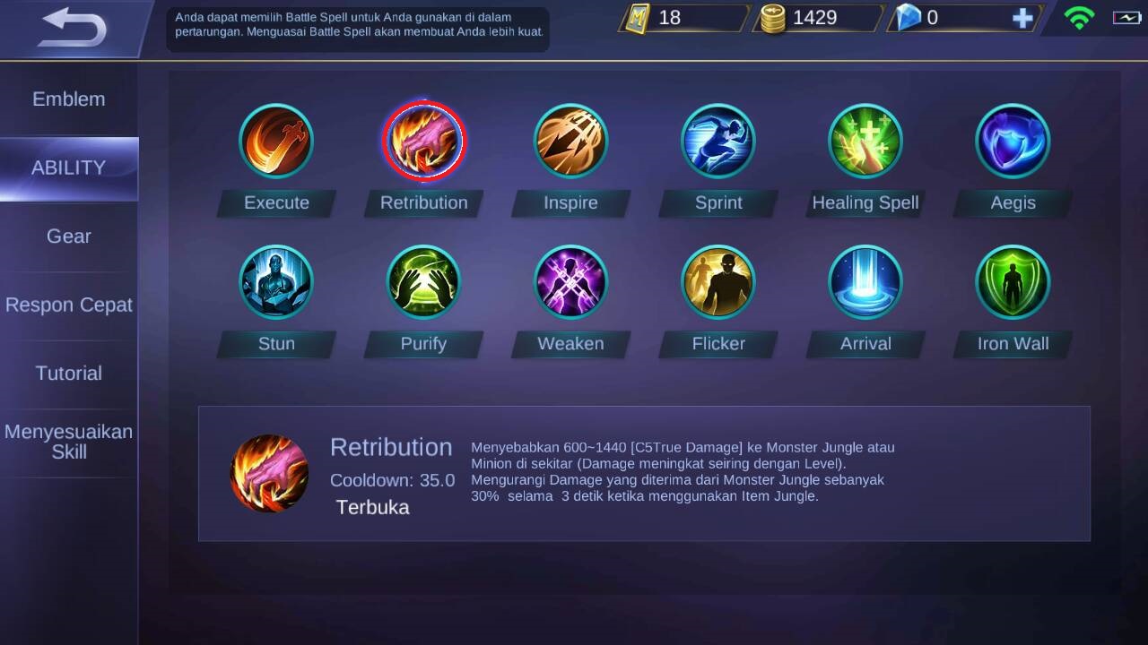 Untuk battle spells dapat menggunakan retribution, karena akan mempercepat proses farming sehingga membuat saber semakin cepat untuk naik level dan jadinya item item yang di rekomendasikan di atas. Retribution juga dapat di gunakan untuk menslow musuh ketika spells ini di upgrade ke lavel 2.
