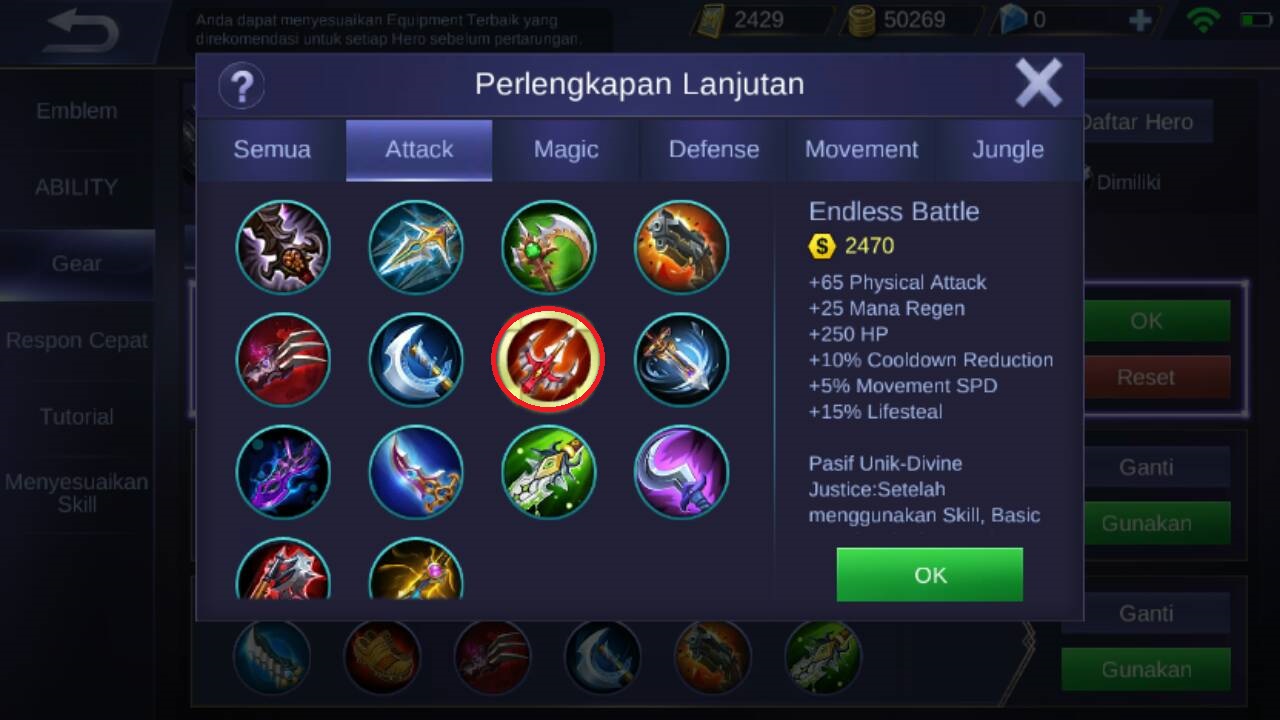 Selanjutnya untuk item yang ketiga bisa mengambil Endless Battle yang berfungsi untuk yang pertama skill ini bisa diambil yang memiliki 65 Physical Attack, 25 Mana Regen, 250 HP, 10% Cooldown Reduction, 5% Movement Speed dan 15% Lifesteal