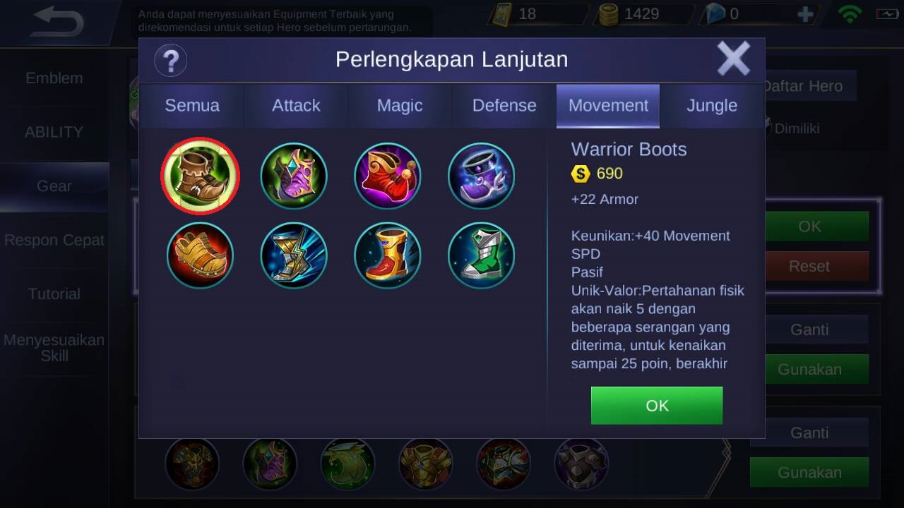 Item pertama yang harus kamu beli adalah sepatu “warrior boots” karena item ini akan menambahkan +22 armor dan +40 movement speed, pasif unik dari item ini yaitu pertahanan fisik akan meningkat 5 dengan beberapa serangan yang di terima Tigreal, untuk kenaikan sampai 25 poin dan akan bertahan selama 3 detik. Jhonson harus membeli item ini di pertama karena untuk menambahakan movement speed dari Tigral itu sendiri.